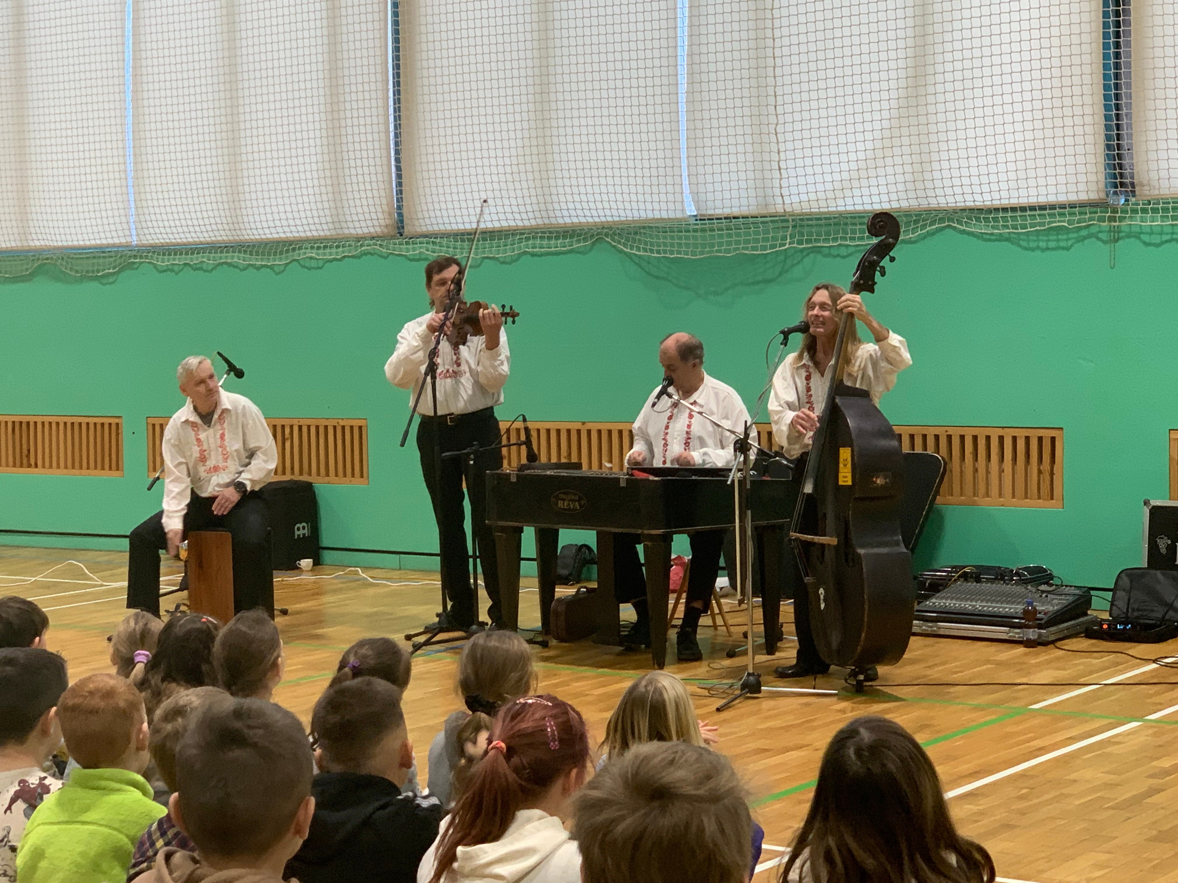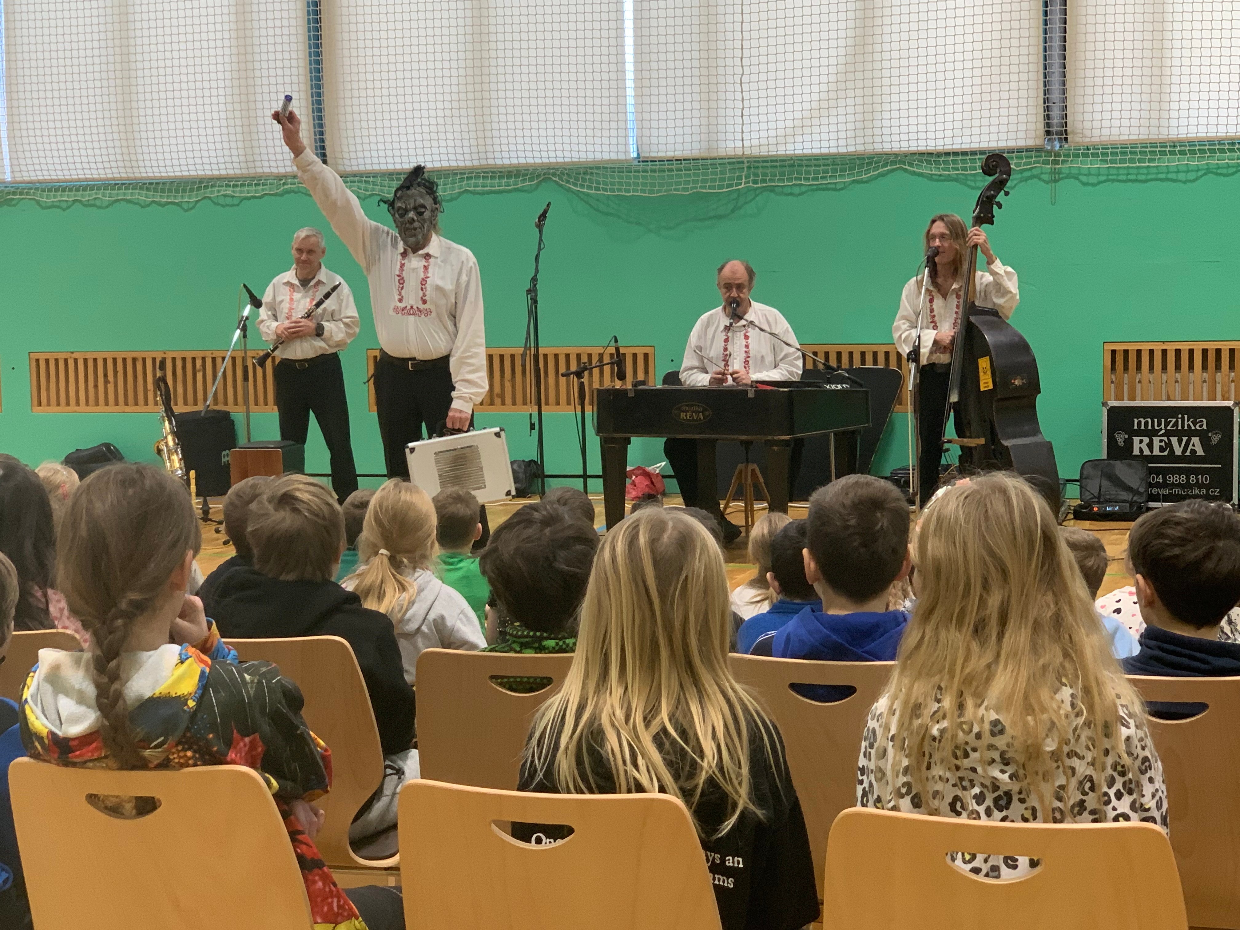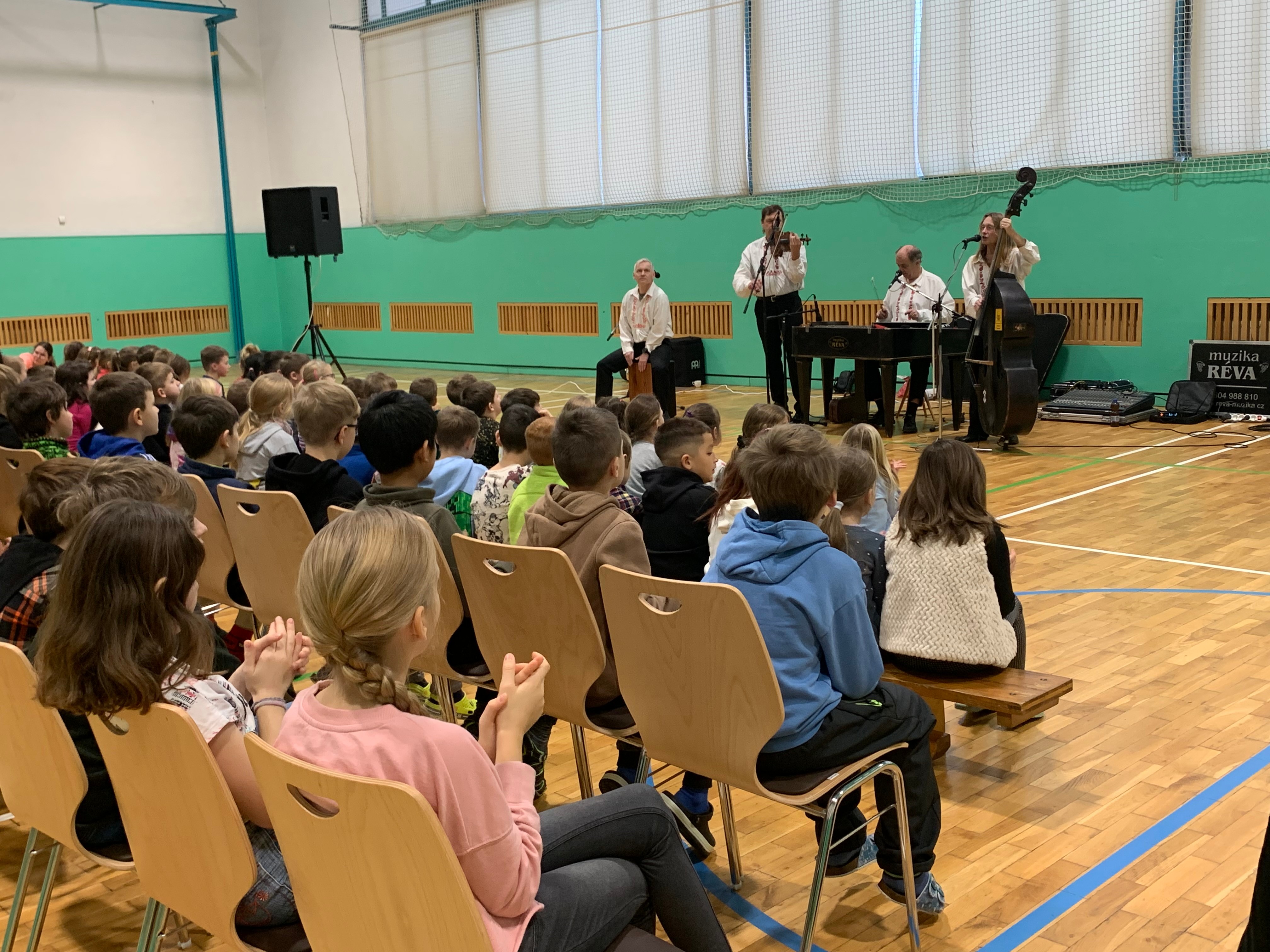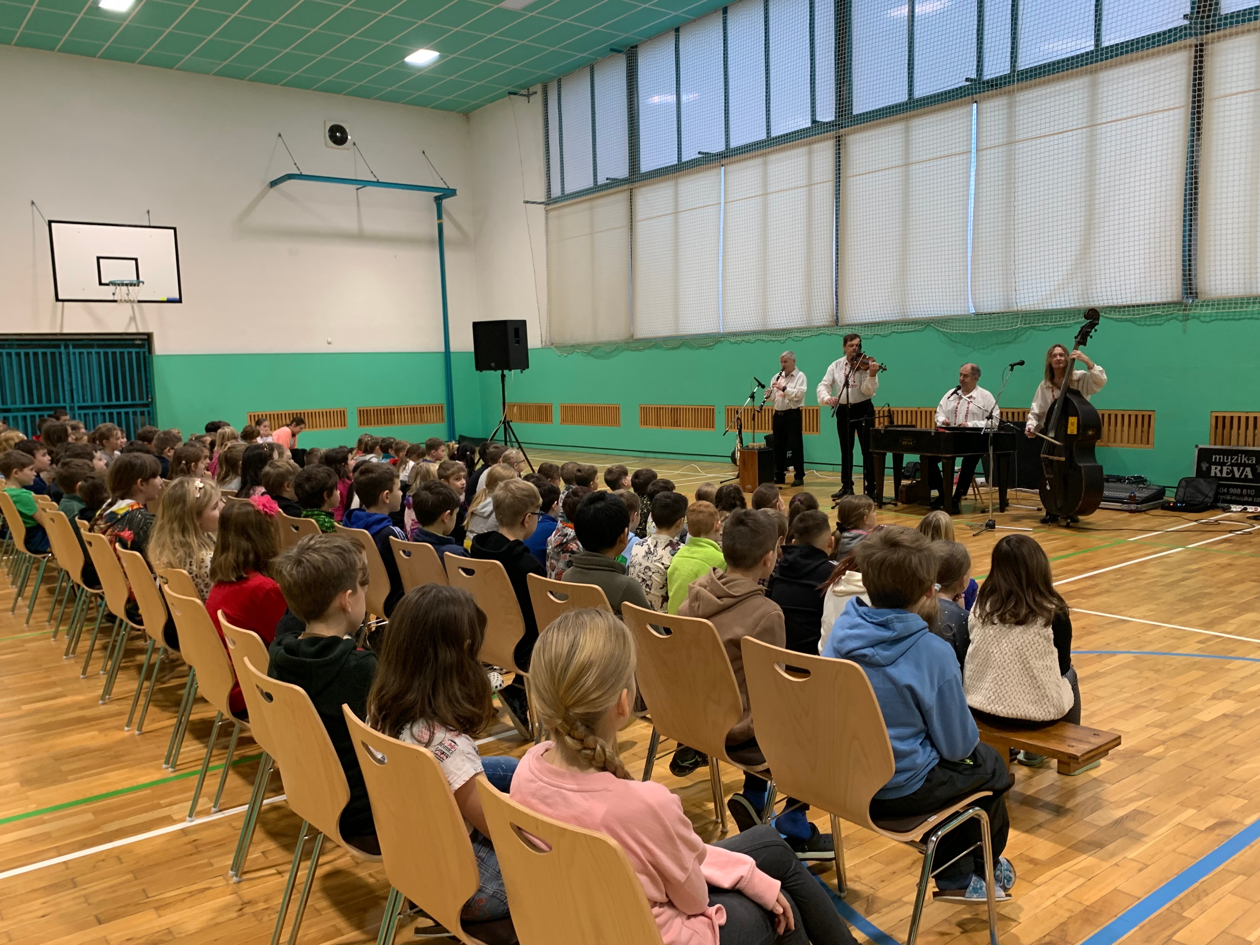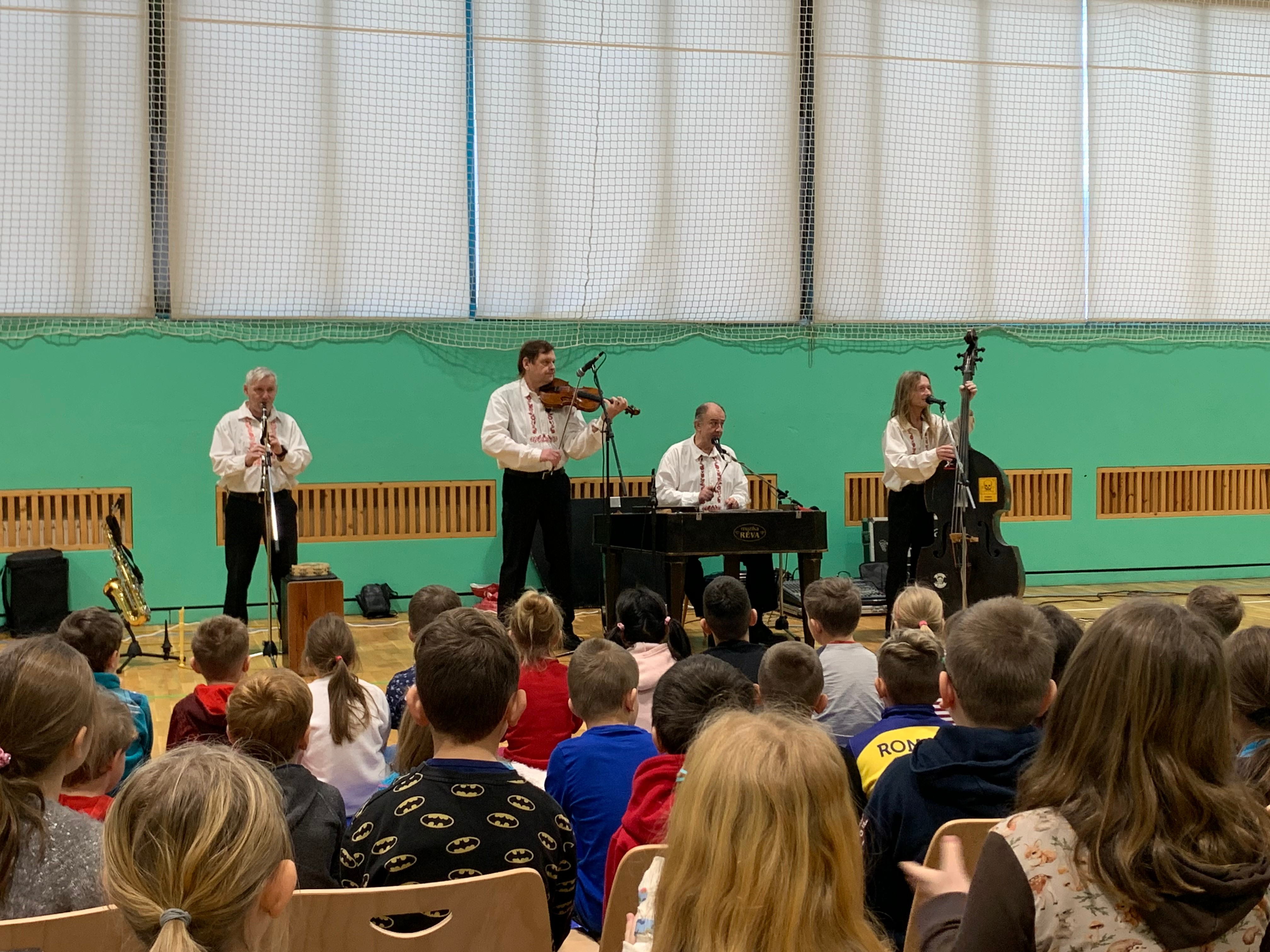 V pondělí 8.1. se děti z 1. stupně zúčastnily vystoupení cimbálové kapely Réva. Většina z nich viděla cimbál, strunný hudební nástroj známý především na Moravě, poprvé v životě. Byl to pro ně unikátní zážitek. Kromě lidových písní zazněly i rockové “pecky” od skupiny Queen či Imagine Dragons nebo klasická hudba v podobě Vltavy od B. Smetany. Děti si mohly zasoutěžit, zazpívat i zatančit. Po obrovském potlesku jim kapela věnovala přídavek.