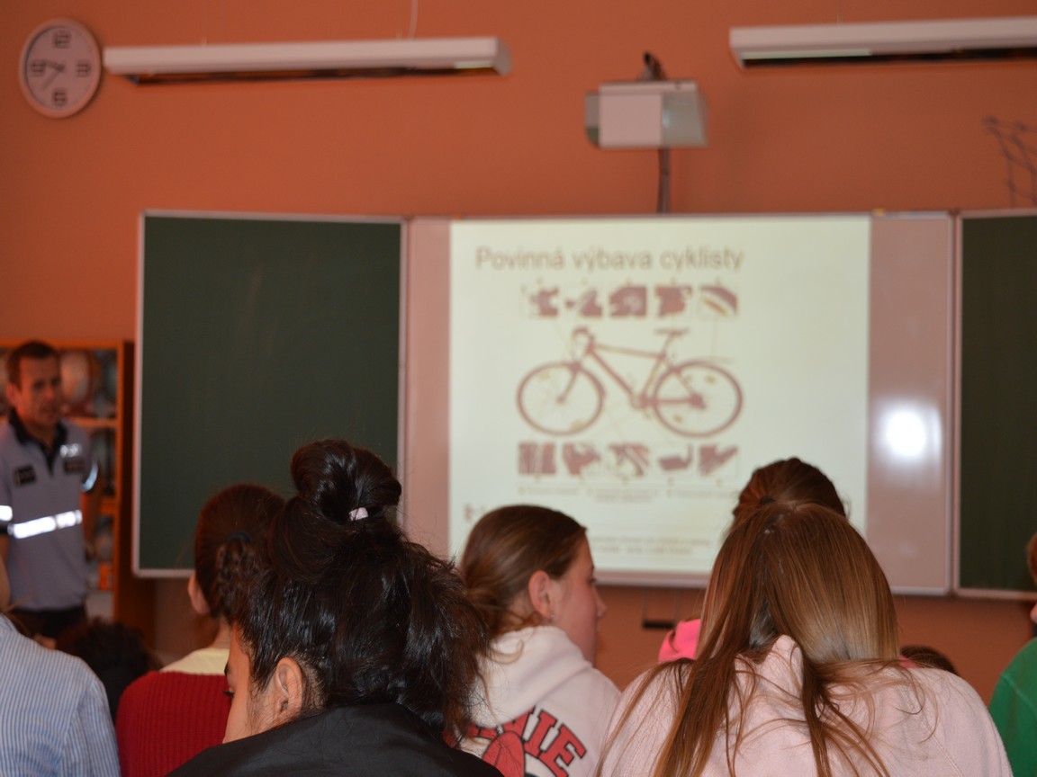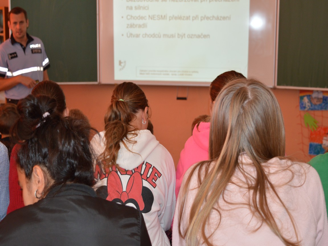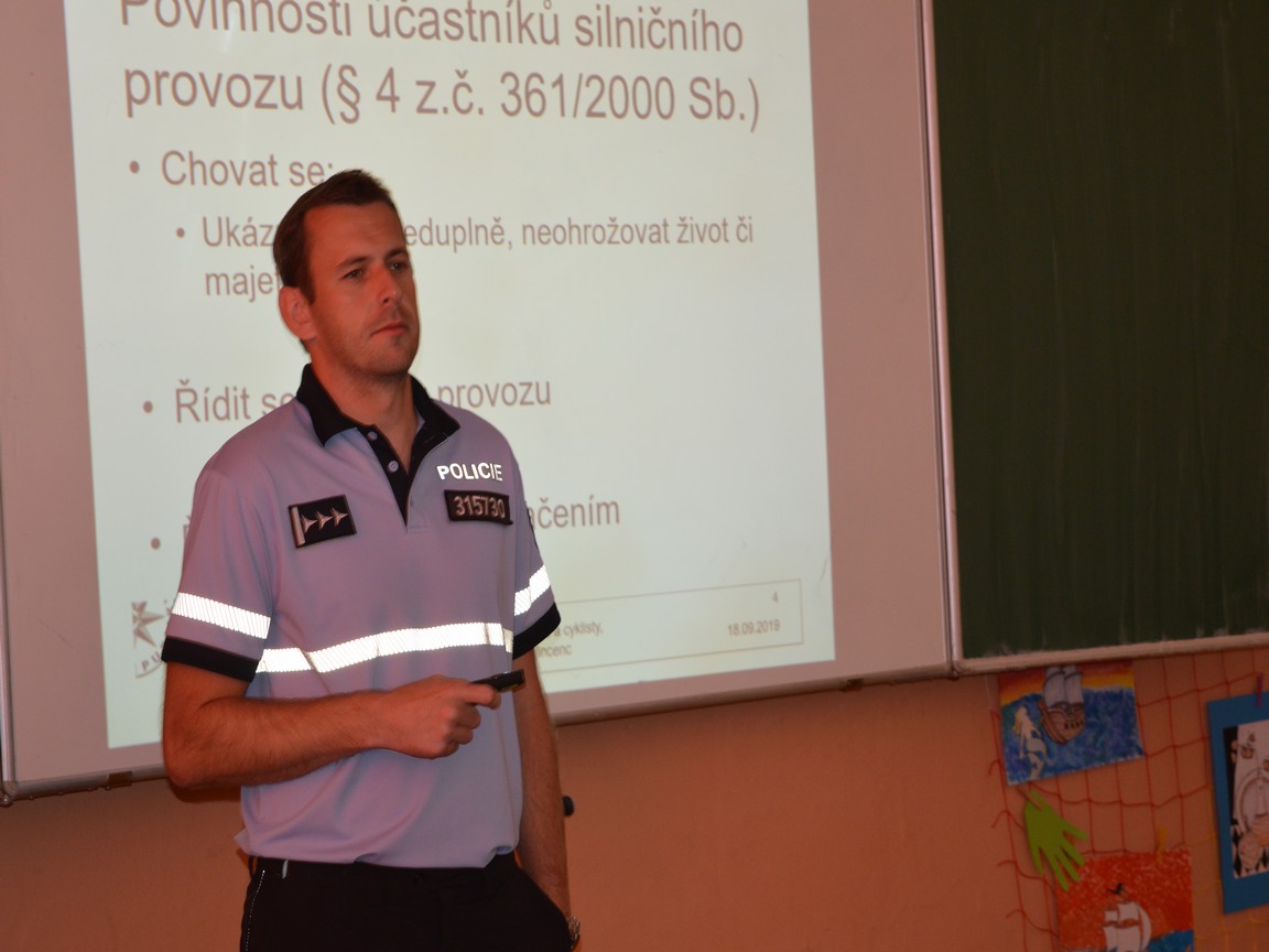 O bezpečnosti k nám přišel ve středu 18. 9. přednášet nprap. Lukáš Vincenc, preventista a tiskový mluvčí PČR v Trutnově. Ve své prezentaci připomněl základní povinnosti chodců a cyklistů, předvedl, jak má správně vypadat vybavené jízdní kolo a upozornil, co a kde děti jako chodci i cyklisté smí. Zmínil se rovněž o statistikách (černá kronika) za loňský rok v našem kraji, také přímo o nehodovosti v Trutnově. Nprap. Vincenc dětem také ukázal, jaké nejčastější chyby způsobují dopravní nehody, a upozornil, že velké procento nehod způsobují mladí řidiči, kteří řídí krátce, ale zato mají obrovské sebevědomí! Proto jezdívají velmi rychle, nepřipoutaní, riskantně předjíždějí a často pak nezvládnou vozidlo při neobvyklém manévru. Ohrozí tak další účastníky či sami havarují. No a za několik let se i z našich žáků stanou mladí řidiči, kteří začnou jezdit na mopedu či motocyklu.