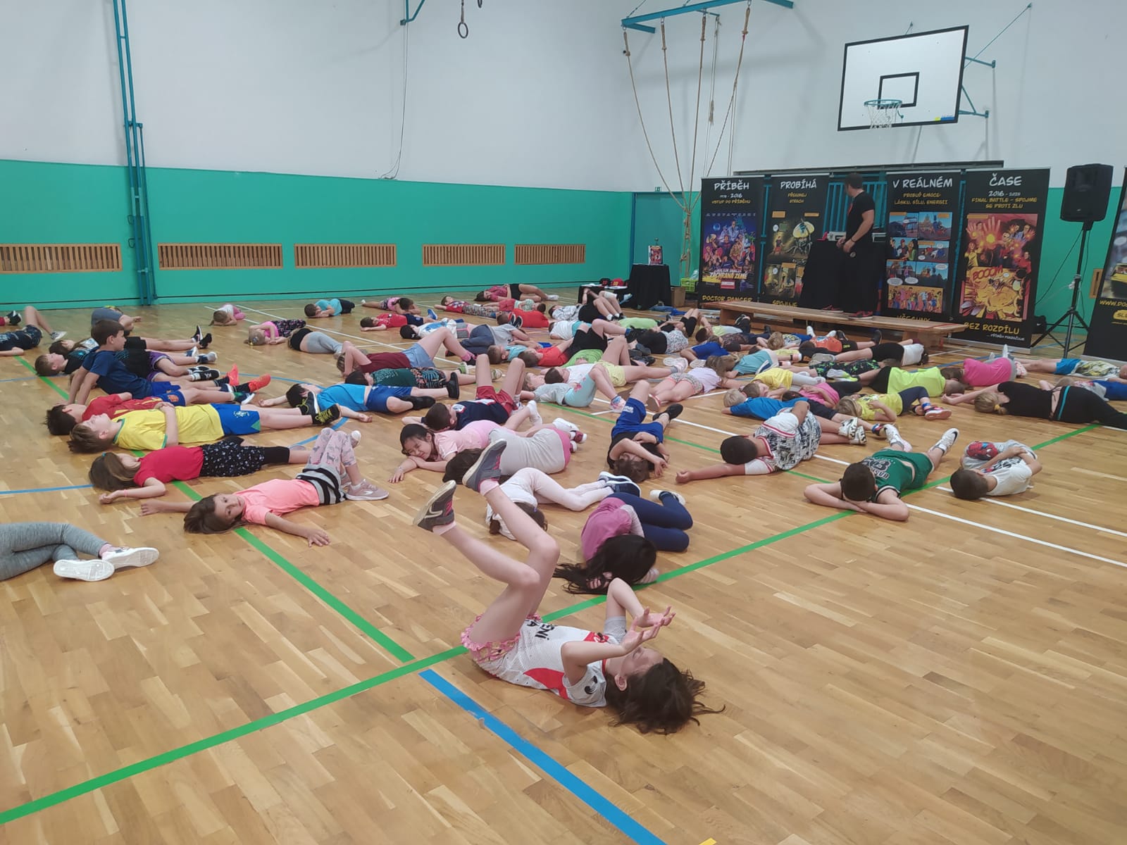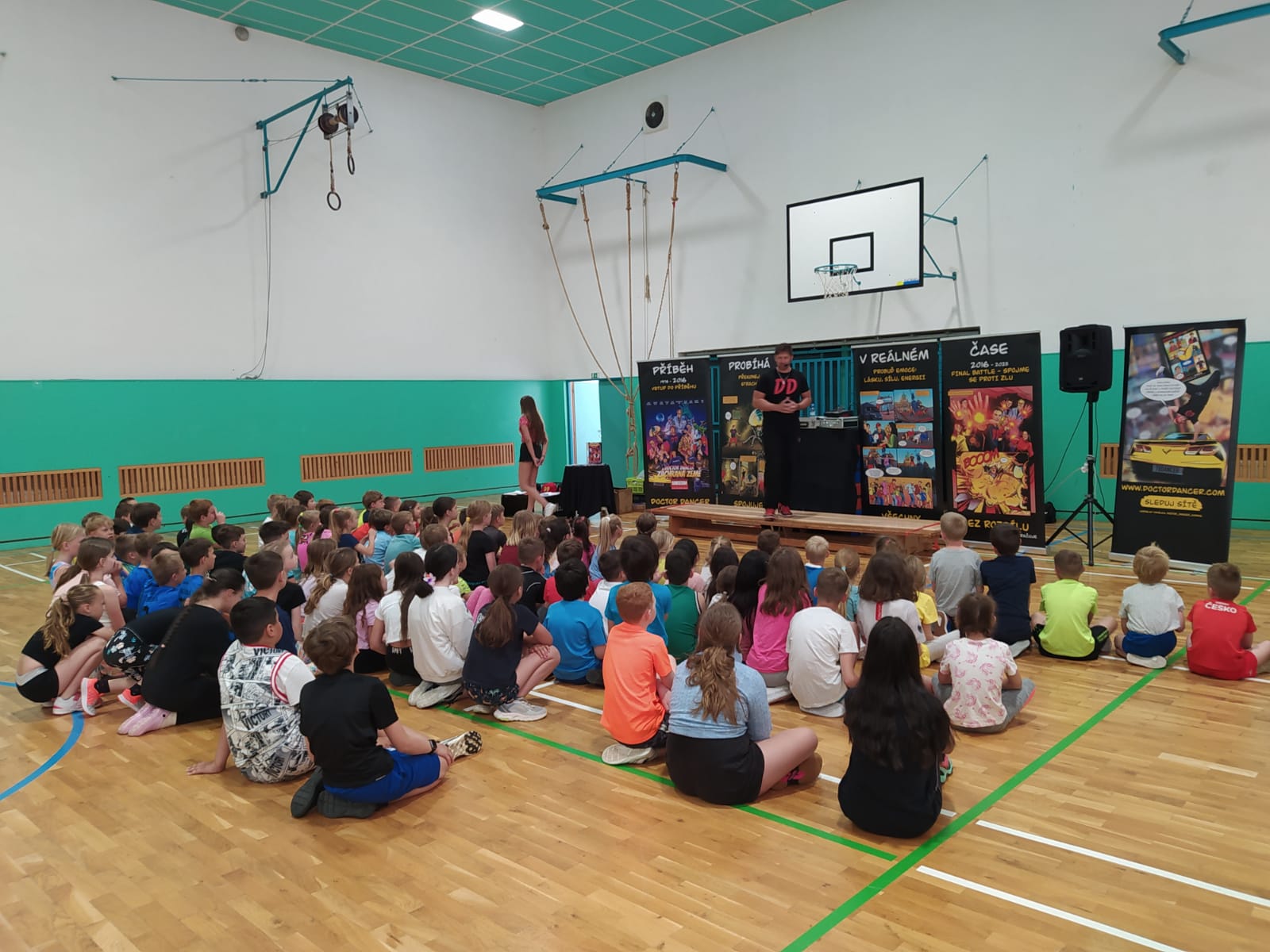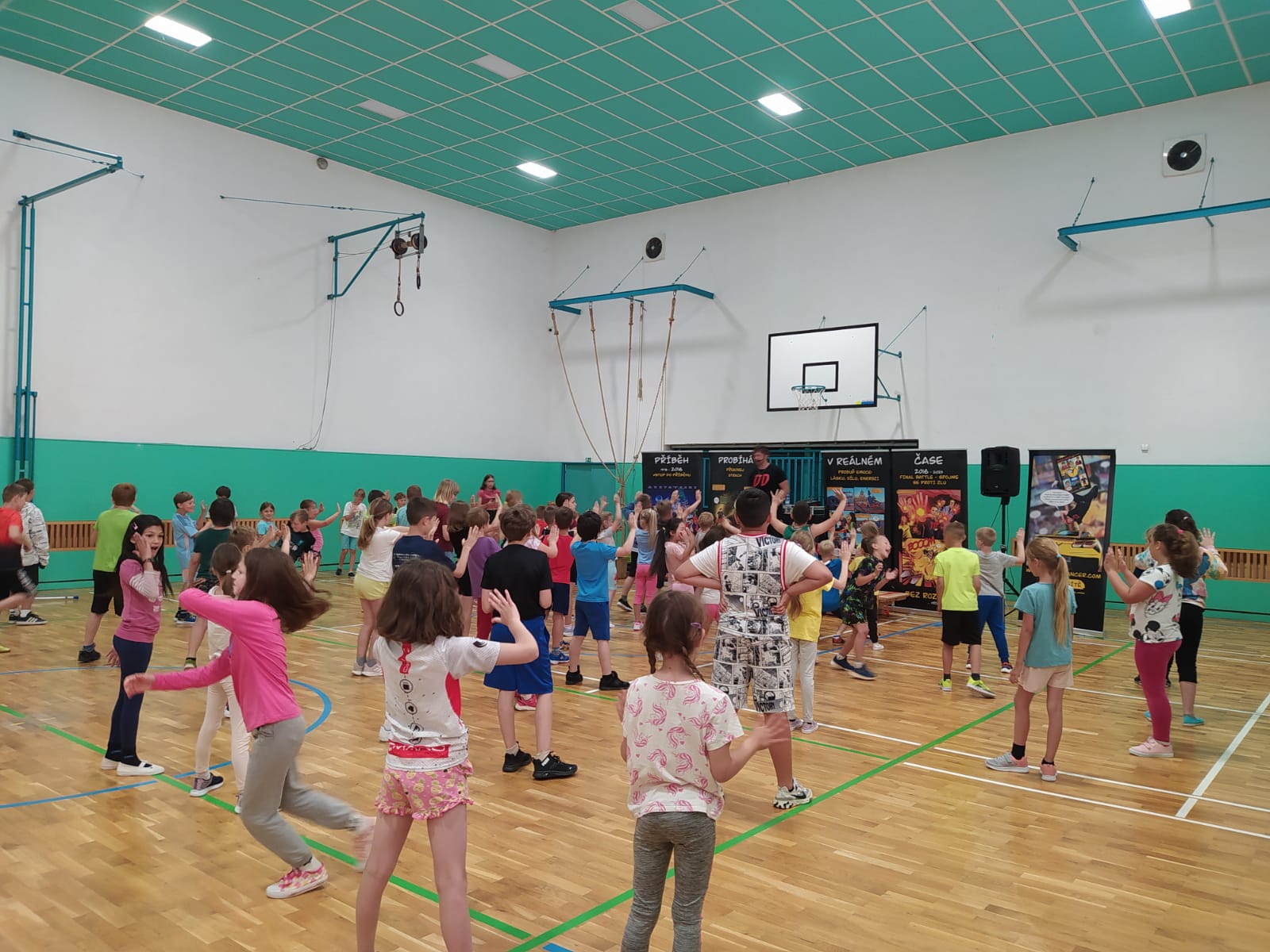 Předposlední červnovou středu se žáci prvního stupně zúčastnili pohybově-hereckého motivačního programu. Cílem bylo rozhýbat každého, což se také podařilo. Pozitivní přístup, vhodně vybraná hudba, promyšlené taneční kroky a energie Doctora Dancera roztančily všechny bez výjimky, a to i paní učitelky. Naučili jsme se krátké choreografie inspirované populárními tanečními styly. Nechyběla ani herecká složka inspirovaná komiksem a videohrami. Žáci odcházeli nadšení a příjemně unavení. Nechybělo rozdávání dárečků a autogramiáda.