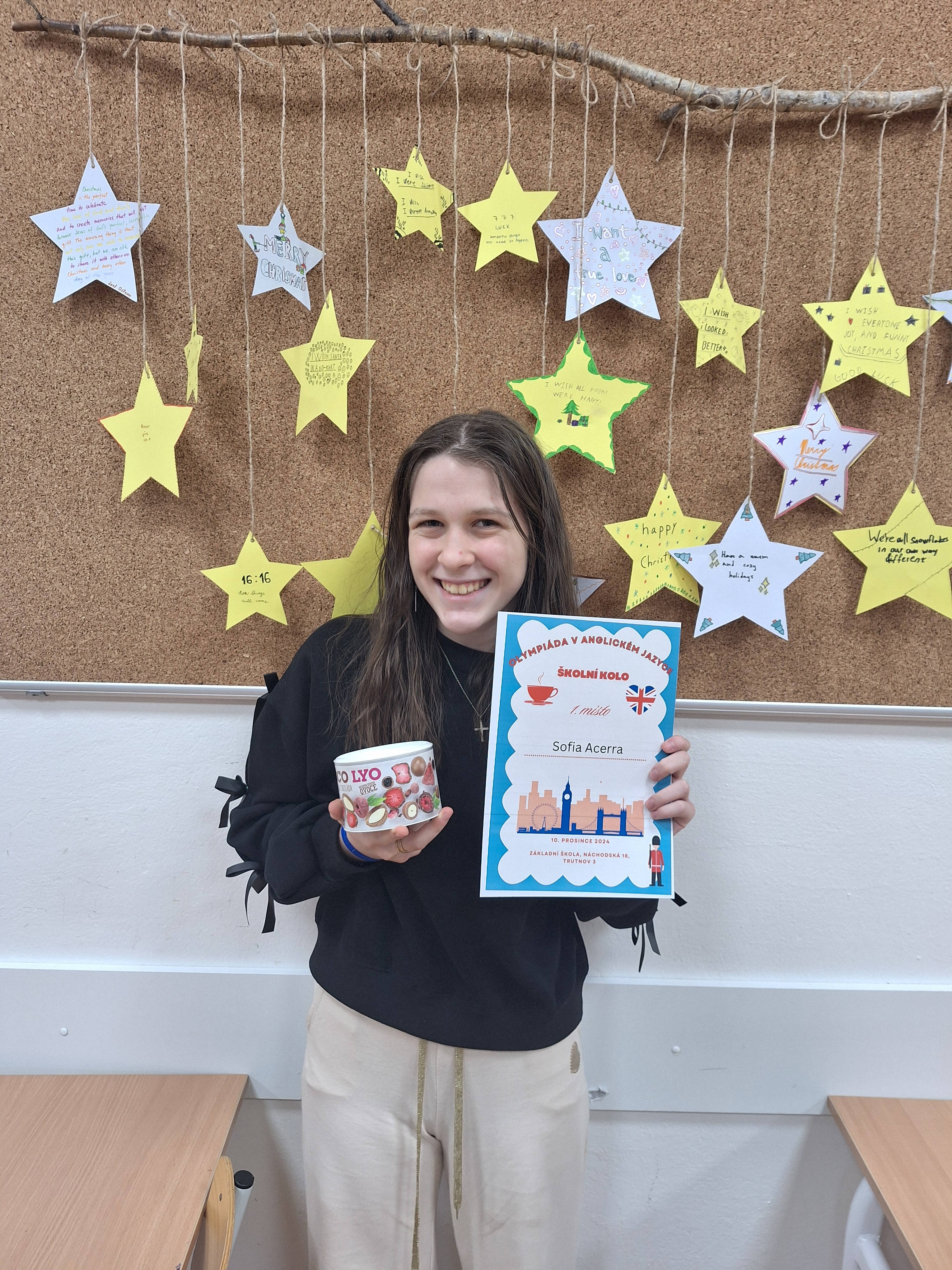 Sofie Acerra (9.B) – Za vynikající jazykové dovednosti a plynulý projev si Sofie odnesla zlaté místo.
