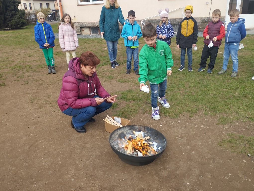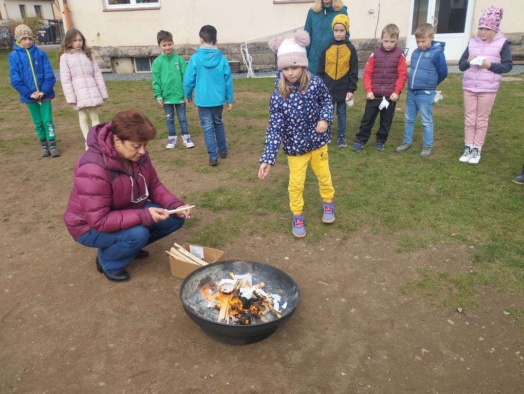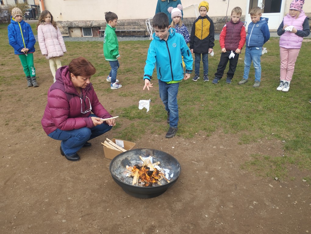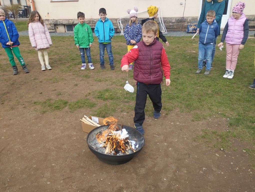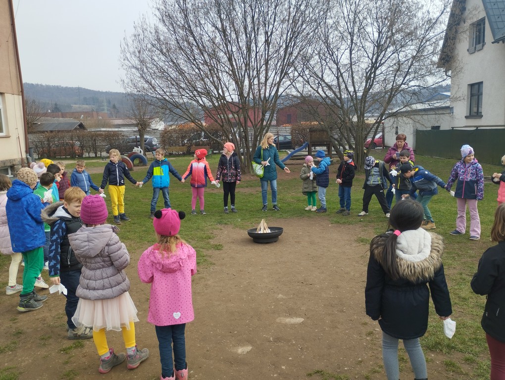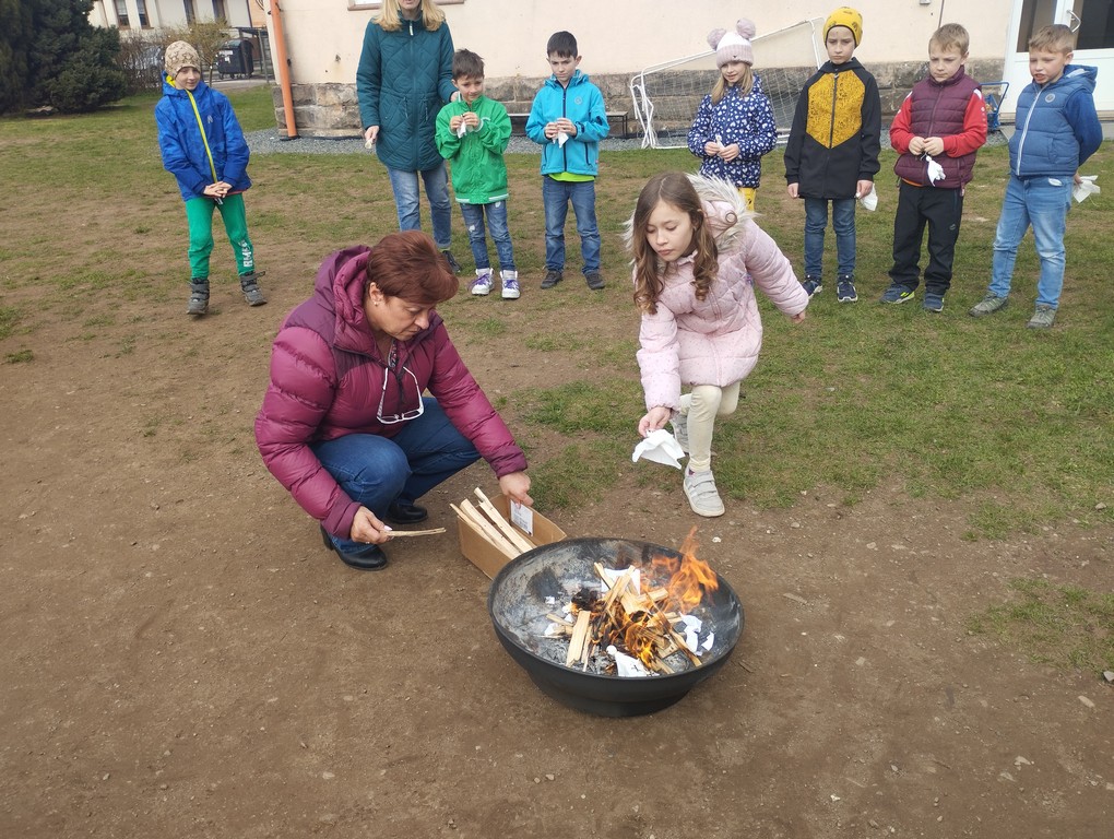 Letos začalo astronomické jaro v brzkých ranních hodinách 20. března. Jarní rovnodennost, prastarý pohanský svátek Ostara, jsme se rozhodli společně oslavit i v druhých třídách. Je to čas, kdy světlo začíná převládat nad tmou, oslavujeme nový život, nové začátky. Děti si připomněly Kolo roku, což je cyklus osmi výročních svátků, kam patří právě i jarní rovnodennost, následně si ho zkusily sestavit. Povídali jsme si o symbolech jara, mezi něž řadíme i setí semen či vynášení Moreny. Rituál vhození Moreny do vody je zvyk, který zakončuje zimu. Každý žáček si vyrobil malou figurku Moreny, které mohl předat své trápení, a následně jsme vhodili tuto figurku do rozdělaného ohně, který je též rituálem našich předků. Společně jsme si zazpívali a dopoledne si velmi užili.